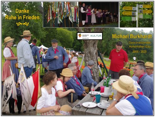 Unter Kultur finden wir im Rechtschreibbuch gleich mehrere Deutungen. Übertragen wir die Hauptaussage „Kultur = Gesamtheit der geistigen und künstlerischen Errungenschaften einer Gesellschaft“ so sind wir in unserer Tätigkeit frei. Satzungsgemäß pflegt unser Verein das Wandern, dient dem Natur- und Umweltschutz, setzt sich für den Schutz und die Pflege der Landschaft ein. Dokumentiert Kleindenkmale und fördert das Brauchtum und das Heimatbewusstsein. Er fördert die naturnahe Erholung und die Erschließung der Landschaft mit Wanderwegen, er unterstützt die Familien- und die Jugendarbeit. Jede Ortsgruppe im Hohenloher Gau kommt diesen Verpflichtungen im Rahmen ihrer Möglichkeiten nach. Bringen Sie sich hier mit Ihren Vorstellungen ein, wir bieten die Plattform. Setzen sie sich mit den Verantwortlichen der Ortsgruppen oder mit mir in Verbindung.Wir freuen uns darauf.Gauübergreifend erhalten Sie zu folgenden Themen bei mir Informationen: • Brauchtum • Volkstanz, Fahnenschwingen, Musik, Liedgut • Erhalt und Pflege von Kleindenkmalen im Hohenlohekreis, Projekt 2005/2016 • Volkstanzgruppe des Hohenloher Gaus im Internet Wir trauern um unseren Gauvorsitzenden Michael Burkahardt+ 29. Aug. 2025Wir danken ihm für seine tatkräftige Unterstützung unserer Tätigkeiten. In seiner Gesellschaft führten wir konstruktive Gespräche und erlebten beste Unterhaltung. Verdient gemacht für die KulturAm 9. Sept. 2022 wurde Christian König, Niedernhall, in Offenburg die Heimatmedaille des Landes Baden-Württemberg verliehen. siehe auch. |